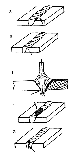Рис. 121 Наружные дефекты сварных швов, выявляемые внешним осмотром: А-подрез; Б-наплыв; В-прожог; Г-незаваренный кратер; Д-свищ