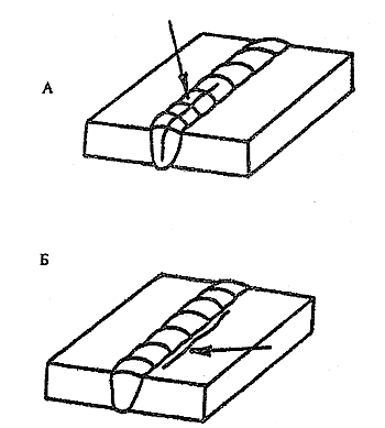 Рис. 122 Трещины в сварном шве и околошовной зоне: А-продольная горячая трещина; Б-холодная трещина в околошовной зоне.