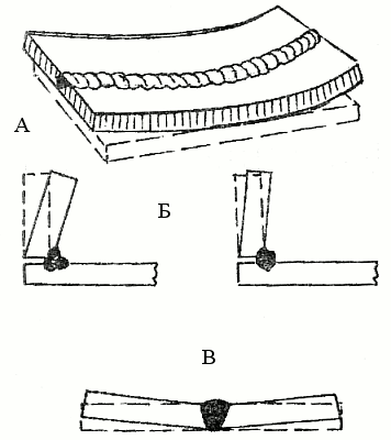 Рис.4 Сварочные деформации: А-деформация пластины; Б-деформация углового соединения; В-деформация стыкового соединения