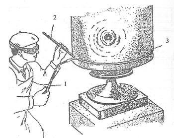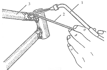 Рис.119 Пайка изделий из труб: 1-горелка; 2-припой; 3-изделие.