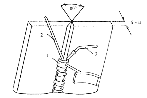 Рис. 118 Сварка вертикального шва с кристаллизатором: 1-кристаллизатор; 2-присадочный пруток; 3-горелка