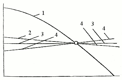 Внешняя характеристика сварочного тока выражает зависимость между напряжением на зажимах выходных клемм и током в сварочной цепи (рис.8). Различают четыре вида внешних характеристик (крутопадающая I, пологопадающая 2, жесткая 3 и возрастающая 4) выбор которых зависит от вольт-амперной характеристики сварочной дуги.