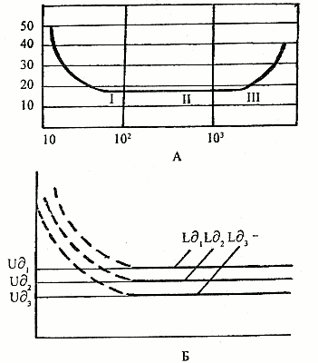 Рис.9 Вольт-амперная характеристика дуги -А; зависимость напряжения дуги ( Uд ) от длины (Ld ) -Б