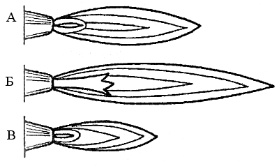 Рис. 70 Разновидности ацетилено-кислородного пламени: А-нормальное; Б-науглераживающее; В-окислительное