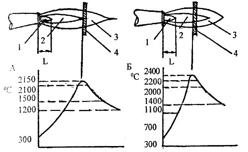 Рис. 71 Динамика роста температур метан-кислородного (А) и пропан-бутан-кислородного пламени (Б): I-ядро; 2-восстановительная зона; 3-факел; 4-свариваемый металл; L-длина ядра