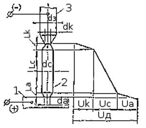 где Lд — общая длина сварочной дуги, см; Uк — длина катодной области, равная примерно 10-5 см; Uс — длина столба дуги, см; Uа— длина анодной области, равная примерно — 10-3÷10-4 см.