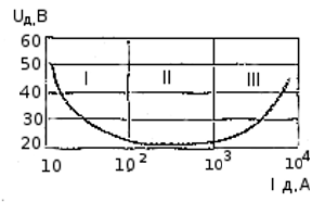 При малых и сверхвысоких величинах тока Uд зависит от величины сварочного тока.