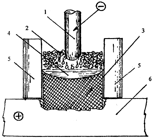 Рис. 44 Электрошлаковая сварка: 1 - апектрод; 2 - электропроводный шлак; 3 - образуемый шов; 4 - сварочная ванна; 5 - перегородки, формирующие шов; 6 — металл