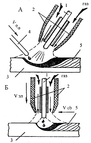 Рис. 29 Сварка в защитном газе: 1-электрод; 2-сопло; З-свариваемый металл; 4-свареная проволока; 5-шов