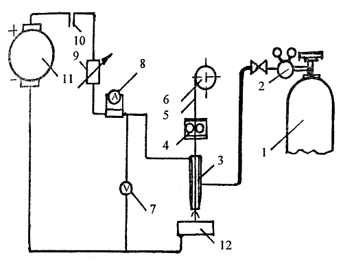 Рис. 30 Сварка плавящимся электродом на постоянном токе обратной полярности: 1-баллон с защитным газом; 2-редуктор; 3-горелка; 4-механизм подачи проволоки; 5-сварочная проволока (электрод); 6-катушка с проволокой; 7-вольтметр; 8-амперметр; 9-балластный реостат; 10-контакгор; 11-сварочный преобразователь; 12-свариваемые батареи