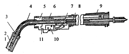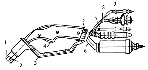5-направляющий канал; 6-рукав для подачи газа и токопровод; 7-9-рукава для