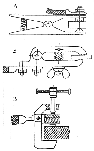 Рис. 14 А Токоподводящие зажимы: А-с пружинным зажимом; Б-с винтовым зажимом; В-с винтовой струбциной