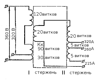 Первичная обмотка состоит из двух катушек одинакового размера, полностью размещенных на одном стержне магнитопровода. Вторичная обмотка также состоит из двух катушек, из которых одна — основная — размещается на стержне магнитопровода вместе с первичной обмоткой, а вторая —реактивная —имеет три отпайки и размещается на другом стержне магнитопровода.