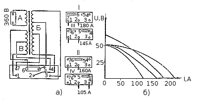 Первичную обмотку выполняют из медного провода с изоляцией, а вторичную обмотку наматывают шинкой. Обмотки пропитывают кремнийорганическим лаком ФГ-9, что позволяет повышать температуру их нагрева до 200° С. Магнитопровод с обмотками размешается на тележке с двумя колесами. Для сварки в монтажных условиях электродами диаметром 3 и 4 мм применяют облегченный сварочный трансформатор ТСП-1. Трансформатор рассчитан на кратковременную работу при коэффициенте загрузки поста менее 0,5 и электродах диаметром до 4 мм. Электрическая схема и внешние характеристики такого трансформатора показаны на рис. 65. Вследствие большого расстояния между первичной обмоткой А и вторичной обмоткой Б образуются значительные потоки магнитного рассеяния. Падение напряжения за счет индуктивного сопротивления обмоток обеспечивает крутопадающие внешние характеристики.