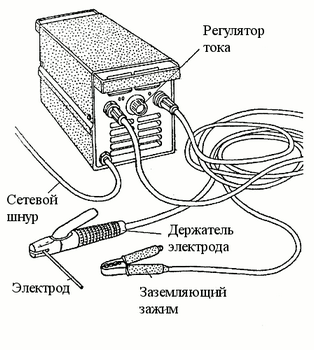 Сварочные трансформаторы промышленного использования, как правило, подключают к трехфазной сети 380 В, что в бытовых условиях не всегда удобно. Как правило, подключение индивидуального участка к трехфазной сети хлопотно и дорого, и без особой нужды это не делают. Для таких потребителей промышленность выпускает сварочные трансформаторы, рассчитанные на работу от однофазной сети с напряжением 220 - 240 В. Пример такого портативного сварочного аппарата приведен на рис.11. Этот аппарат, обеспечивающий разогрев дуги до 4000°С, уменьшает обычное сетевое напряжение, одновременно повышая сварочный ток. Ток в установленном диапазоне регулируется с помощью ручки, смонтированной на передней панели аппарата. В комплект аппарата входит сетевой кабель и два сварочных провода, один из которыхсоединен с электрододержателем, а второй - с заземляющим зажимом.