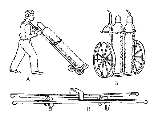 Рис. 128 Правильное перемещение баллонов на тележках: А-тележка для одного баллона; Б-тележкадля двух баллонов; В-носилки для одного баллона.