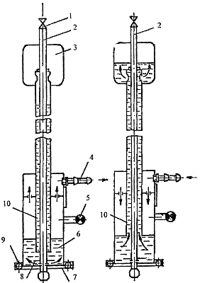 Рис. 75 Водяной предохранительный затвор низкого давления для ацетилена: А-при нормальной работе; Б-в случае обратного удара; 1-вентиль; 2-трубка газоподводящая; 3-воронка; 4-выходной ниппель; 5-контрольный кран; 6-корпус; 7-дно затвора; 8-диск-рассекатель; 9-резиновая прокладка; 10-предохранительная трубка